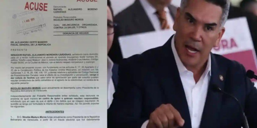 Moreno, también senador, señaló que la denuncia busca que el mandatario venezolano responda ante la justicia mexicana por presuntos nexos con el crimen organizado y recordó que recientemente el gobierno de Estados Unidos ofreció una recompensa de 50 millones de dólares por información que lleve a su captura, acusándolo de “utilizar cárteles de México y Venezuela para el tráfico de drogas”.