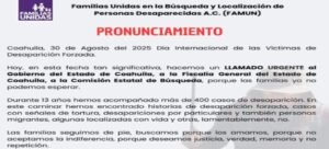 La falta de justicia se suma al dolor de no conocer la suerte de miles de personas. Por ello, este 30 de agosto, en el marco del Día Internacional de las Víctimas de la Desaparición Forzada, colectivos como Fuundec-Fundem, FAMUN y Grupo VIDA saldrán a las calles de Saltillo, Torreón y Piedras Negras, para visibilizar un problema que, pese al cambio de administraciones en todos los niveles de gobierno, continúa sin resolverse.